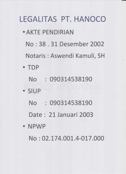 PT HANOCOBerdiri sejak tahun 2003, Perusahaan bergerak dibidang Jasa Desain Interior dan Kontraktor Interior, Exterior, Furniture : Office, Banking, Rumah Tinggal maupun bangunan komersial lainnya. VISI Menjadi salah satu perusahaan jasa interior dan exterior yang terpercaya dengan memberikan produk yang berkualitas dan menciptakan nilai yang optimal. MISI Mendukung pembangunan nasional melalui pembangunan proyek Interior Exterior besar maupun kecil untuk memberikan kepuasan pelanggan melalui ketepatan dalam waktu kualitas dan biaya. Melalui penerapan teknologi dan sumber daya manusia yang handal dan memadai PT. HANOCO berusaha memberikan yang terbaik untuk kepuasan pelanggan.
